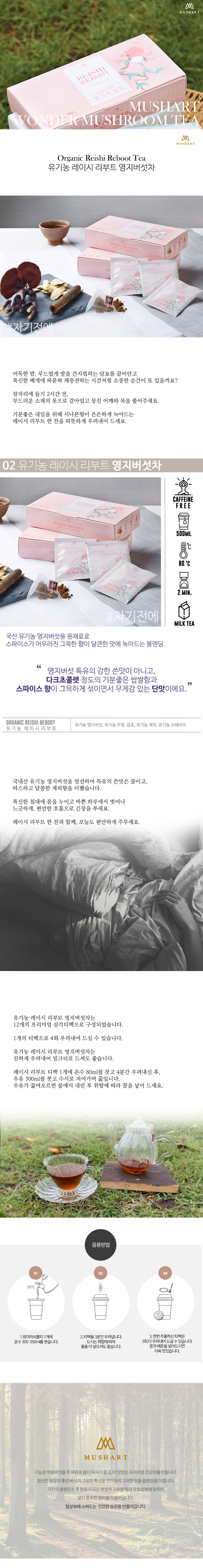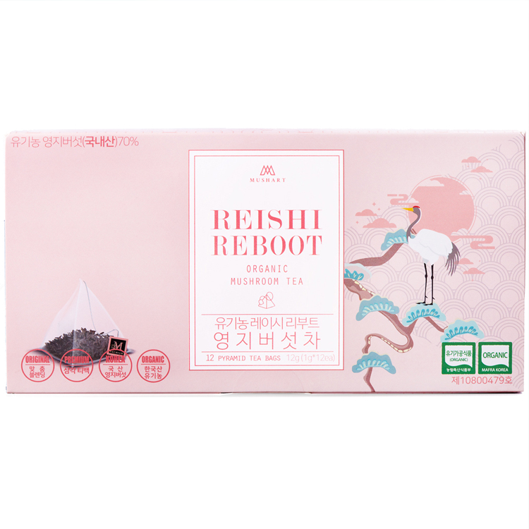 Organic Reishi Reboot Tea is made with selected Korean Reishi mushroom. Organic Reishi mushroom blended with cinnamon and hint of licorice roots, crafting mild sweetness along with delicate harmony of chocolate, spice-kissed finish.